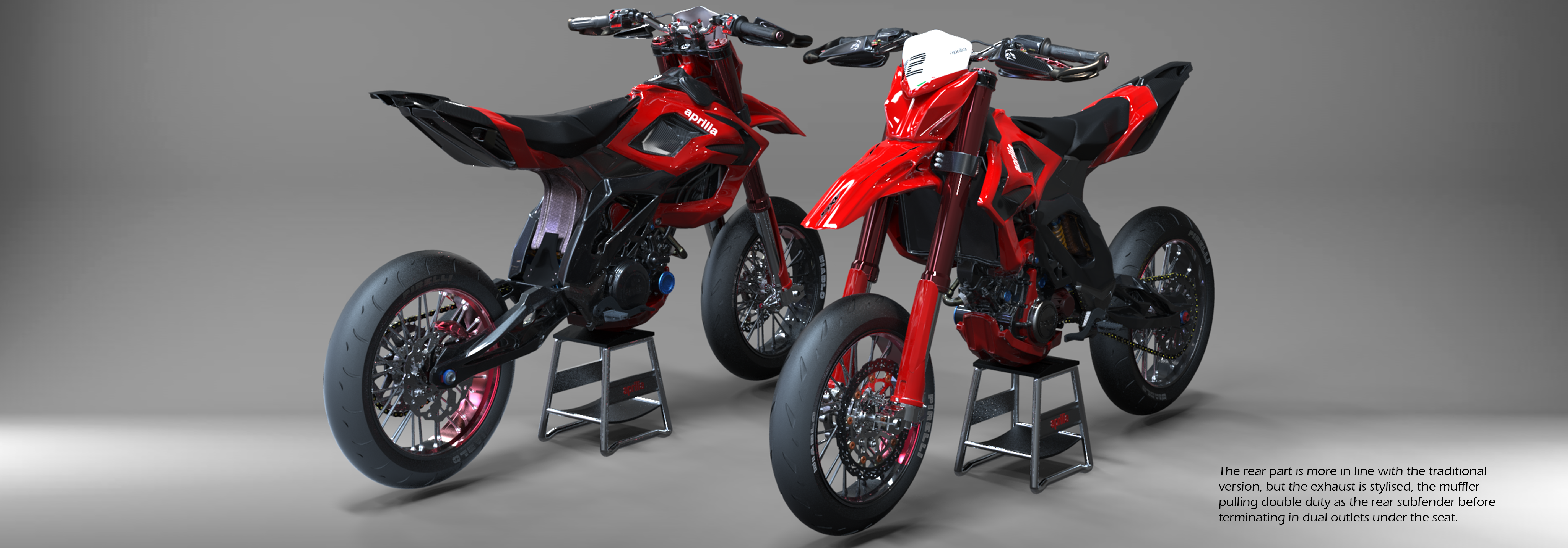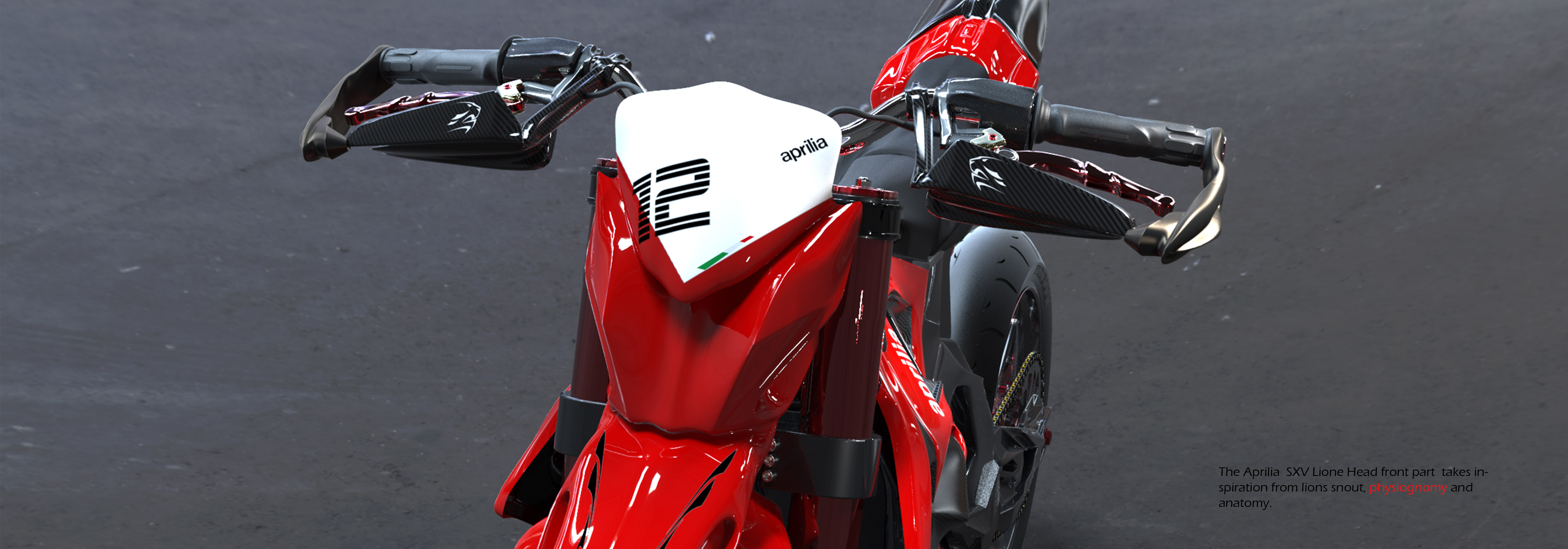 This concept received high praise by Marco Lambri, Senior Vice President Vehicle Design Centre Product Development and Strategies - Piaggio Group. I redesigned the Aprilia SXV supermoto, on the base of the observation of animal anatomy rudiments (muscles, structures, bones) and semiotics of a feline (agile, aggressive, strong, flexible, sexy). I have chosen the lion as it is the symbol of Aprilia (based in Veneto region) and an historical symbol of the powerful Republic of Venice. The front shape of the concept I have realized is a synthesis of a lion head, the tank is inspired by the muscle fibres of the animal shoulders and the work-fatigue they have to perform. In some parts, like the rear area, I have preferred to keep a strong relationship and linkage with the original Aprilia SXV style. I would like to thank Hexagon Metrology - Cardiff Racing for the basic Aprilia 3D engine point scanning and Camka for some 3d data for the front fork.